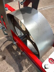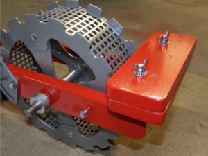 Roue AV ajourée : permet une meilleure motricité pour entraîner le distributeur de graines et facilite l’émottage de la terre en préparation de la ligne de semis.